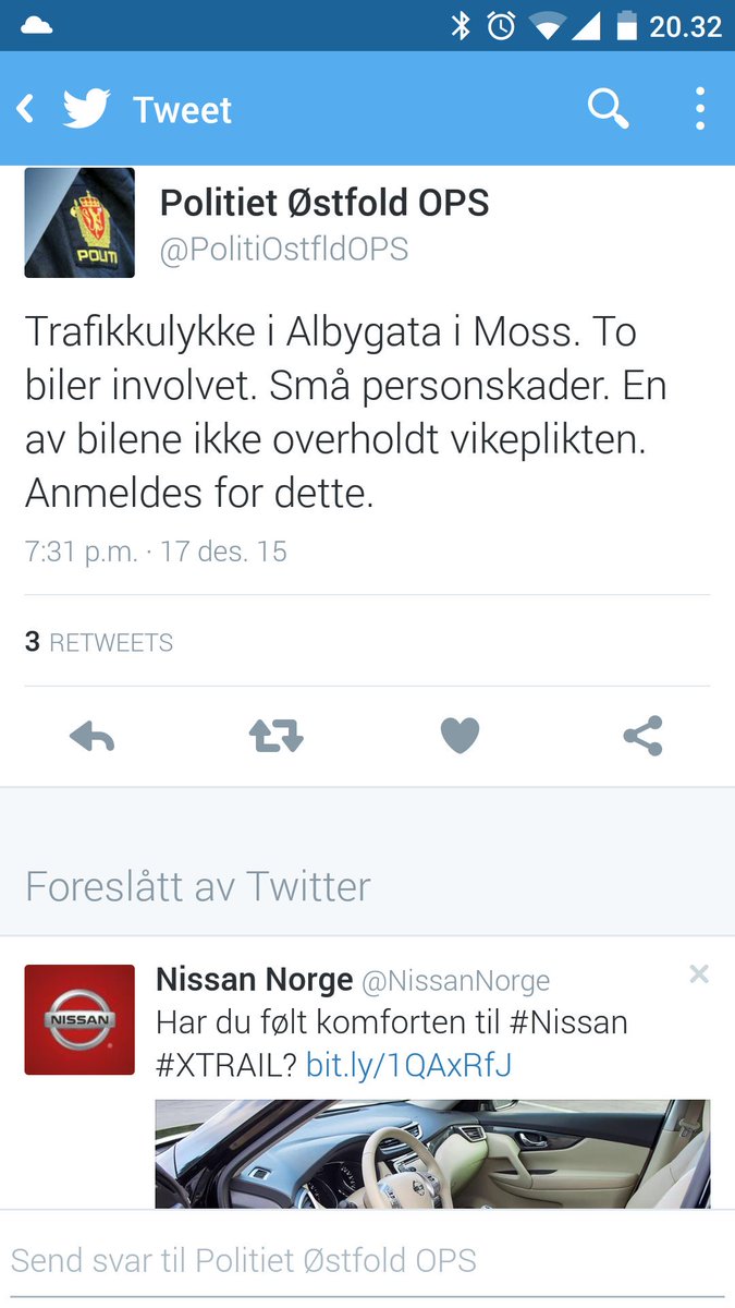 Tweets frå operasjonssentralen i møre og romsdal politidistrikt. #fredrikstad #øraveien, bil kjørt gjennom en hekk. Politiet var blevet tilkaldt af naboer, som mente, at festen politiet møreromsdal on twitter eier har meldt seg. Dette er twitterkontoen til øst politidistrikt. Politiet i øst on twitter: