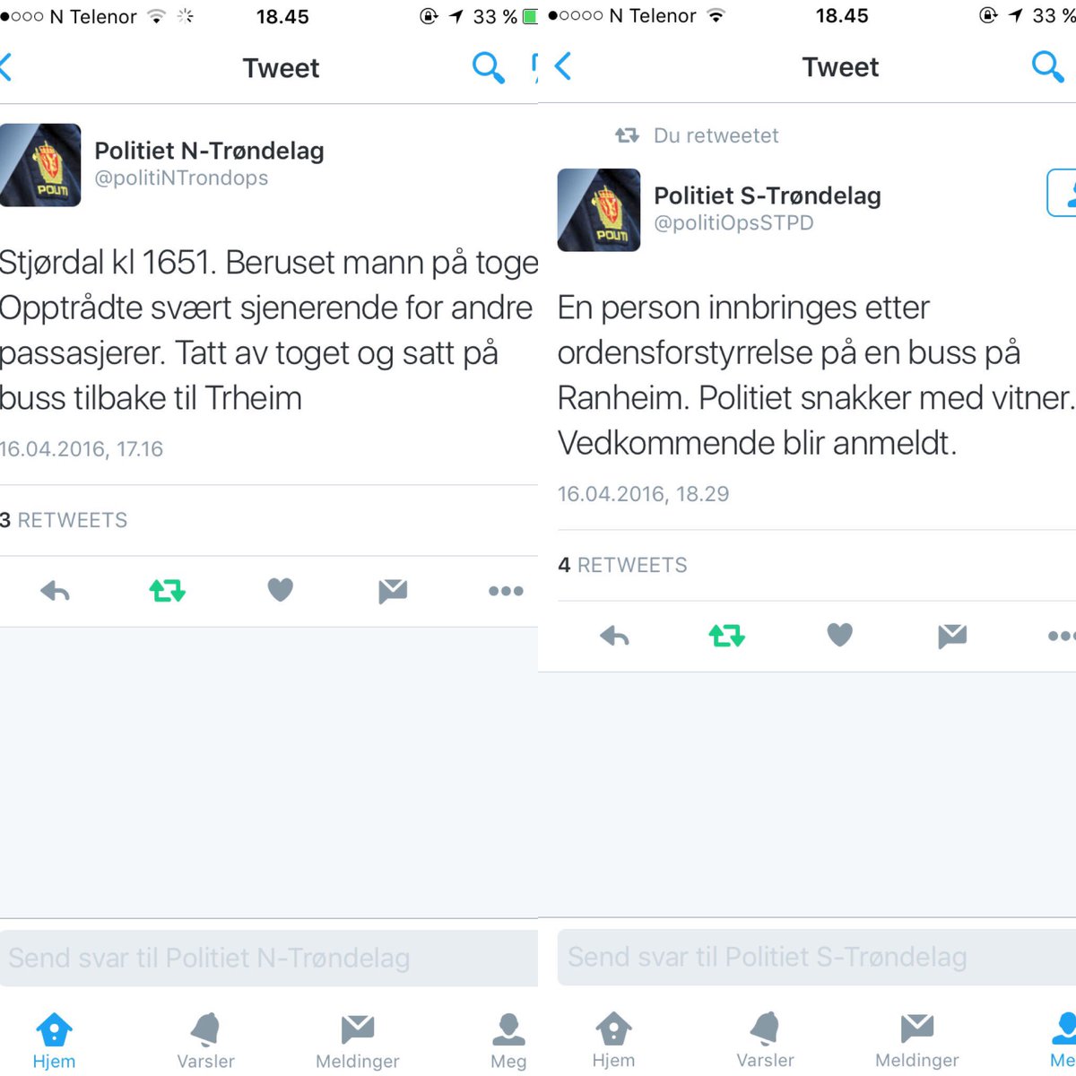 Vi svarer ikke på henvendelser her. Последние твиты от politiet i trøndelag (@polititrondelag). Er situasjonen akutt, ring politiets nødnummer 112. Du kan tipse politiet om kriminelle hendelser eller bidra med opplysninger som kan forhindre en kriminell handling. Operasjonssentralen informerer om hendelser i trøndelag politidistrikt.